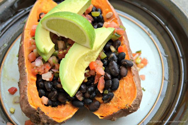 Totally authentic? Maybe not quite, but this simple recipe is both easy enough and delicious enough that I am posting it here with no shame. Plus it’s got sweet potatoes, avocados, beans and pico de gallo- all authentic ingredients- combined into a flavorful dish that is quite tasty, very healthy, easy to prepare and the total cook time is just 25 minutes!