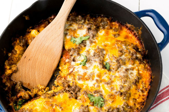 Because who has time to acutally make tamales? This simple spin on tamales, the Mexican Tamale Pie is a simple but brilliant mix of onions, bell peppers, corn bread, beef and cheese that tastes just like the real deal without all the work and is guaranteed to elicit great dinner reviews from your guests.