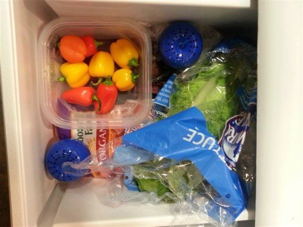That “Blue Apple” absorbs the ethylene gas (ethylene gas helps fruit ripen… but it also makes ripe fruit spoil faster). Throw it in with your fruits and vegetables and you should see your groceries lasting a little bit longer.