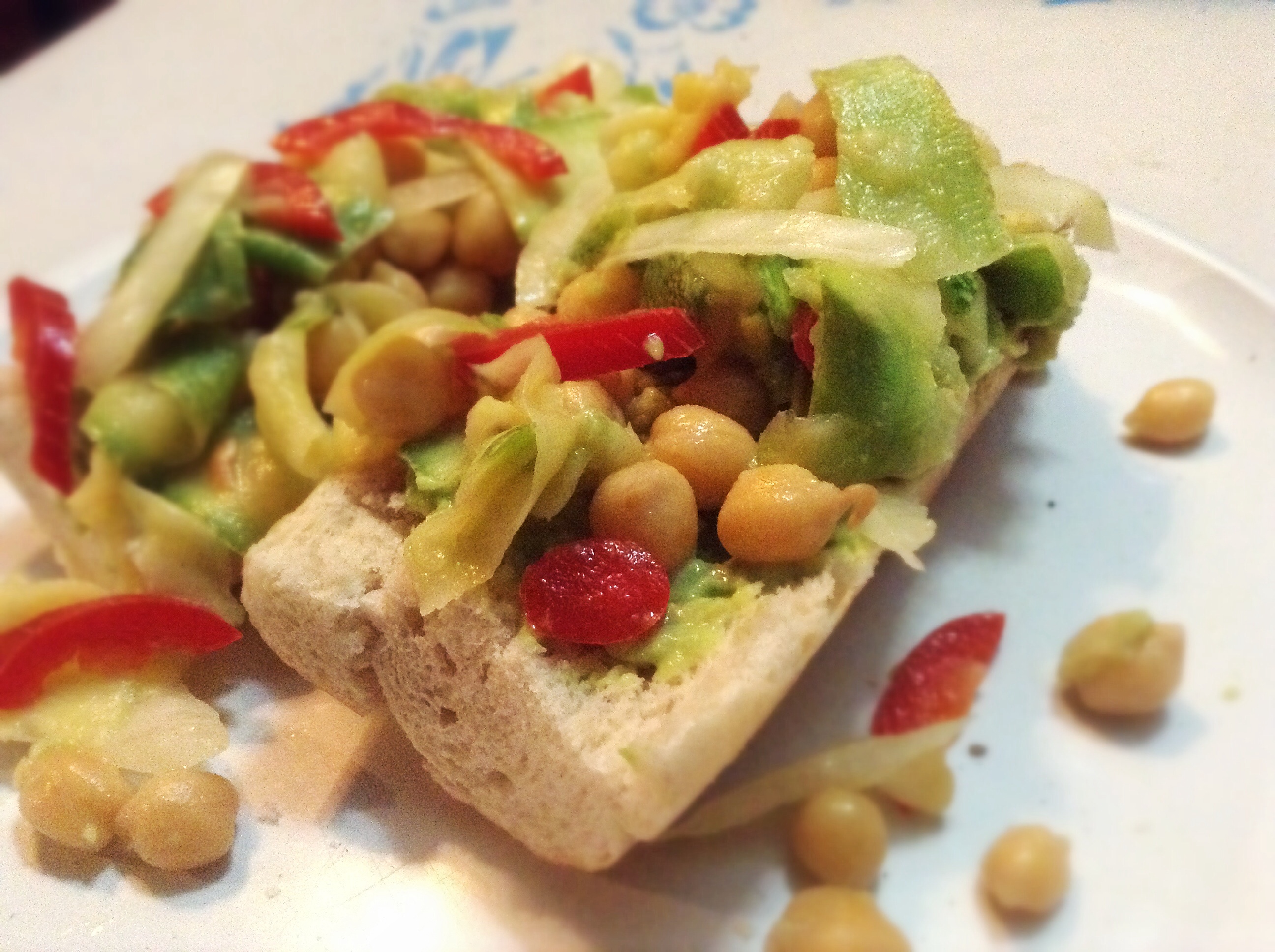 Slice the crusty bread in half lengthwise. Mash the avocado and spread on the bread, top with a handful of marinated veggies and chickpeas and enjoy!