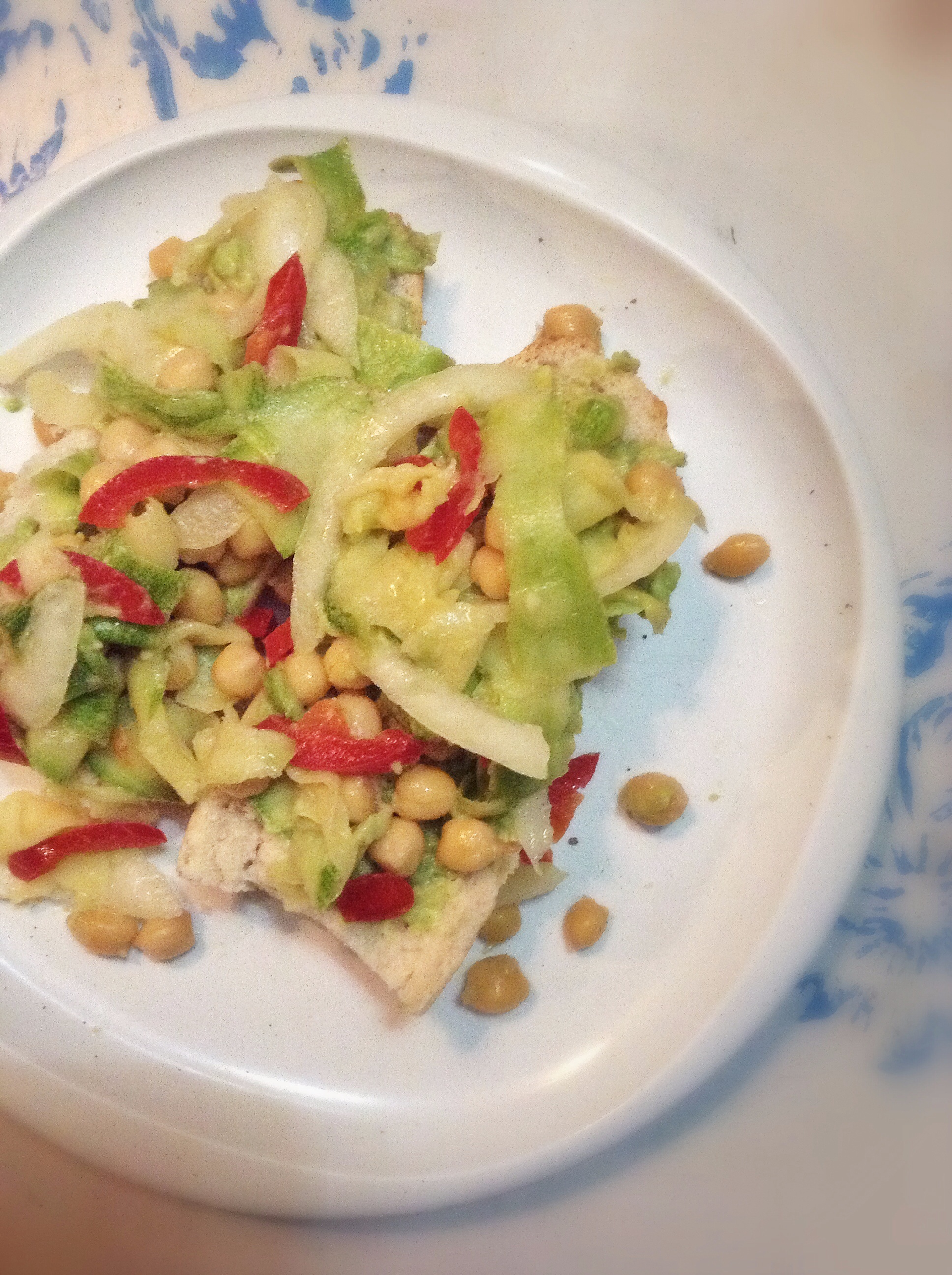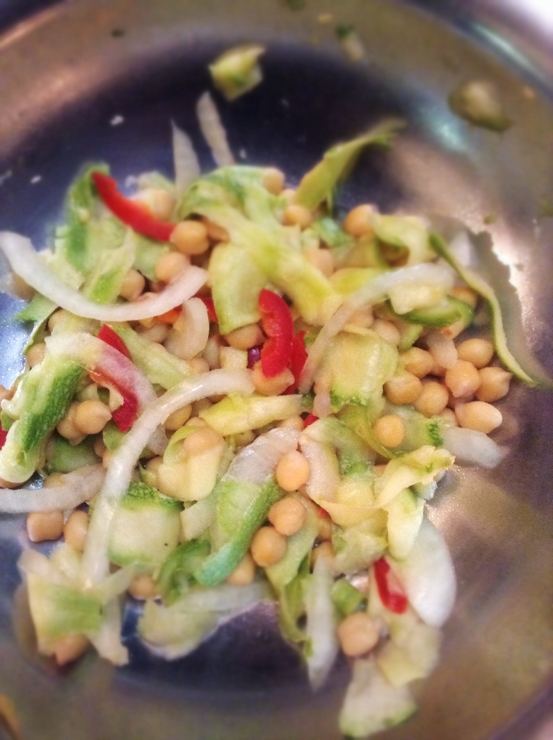 “Ribbon” the zucchini using a vegetable peeler to turn it into thin ribbons. Ribbon as much as you can, then thinly slice the rest. Combine the onions, zucchini, pepper, lemon juice, olive oil, salt and chickpeas. Allow everything to marinate at least 20 minutes.