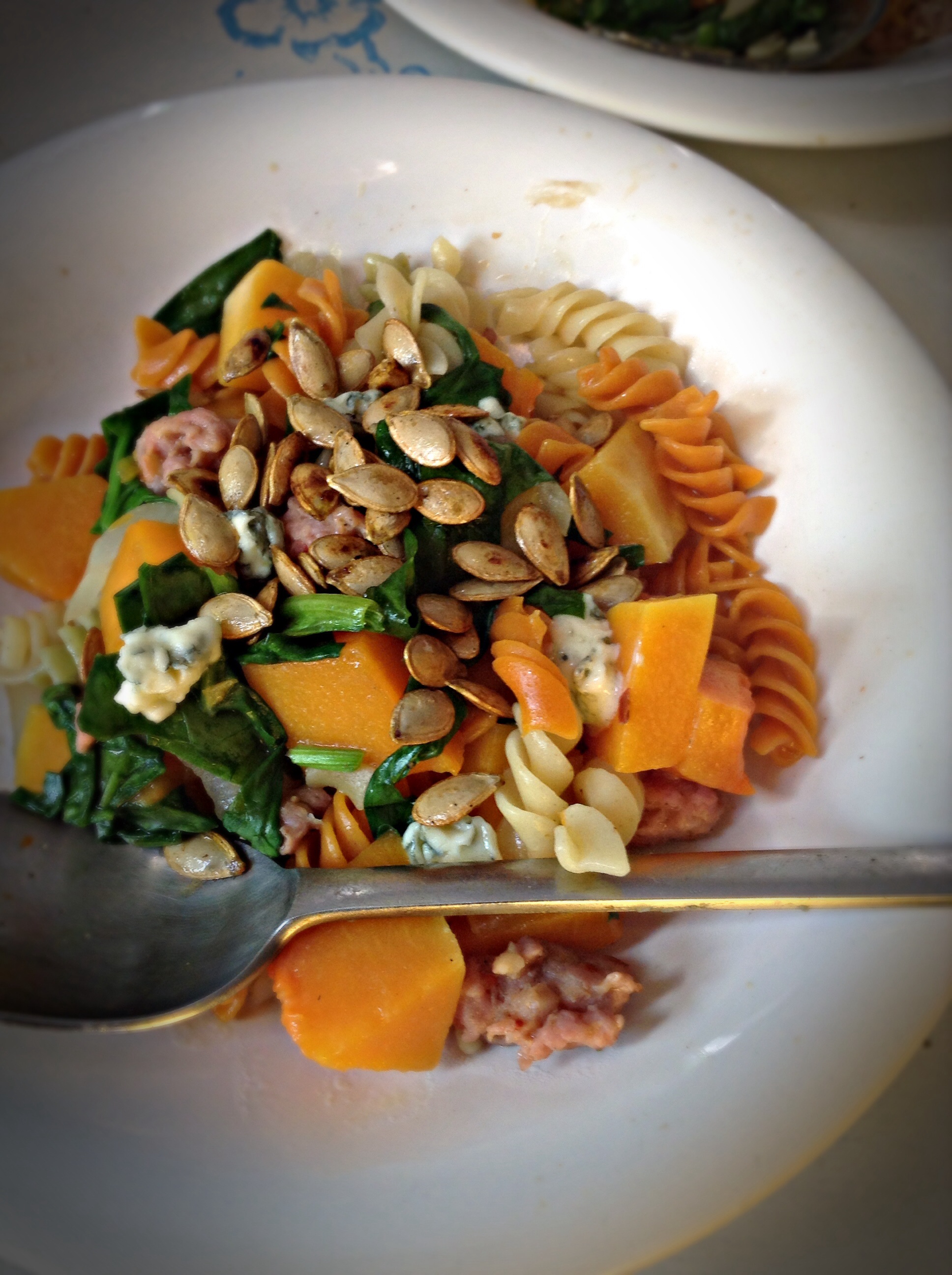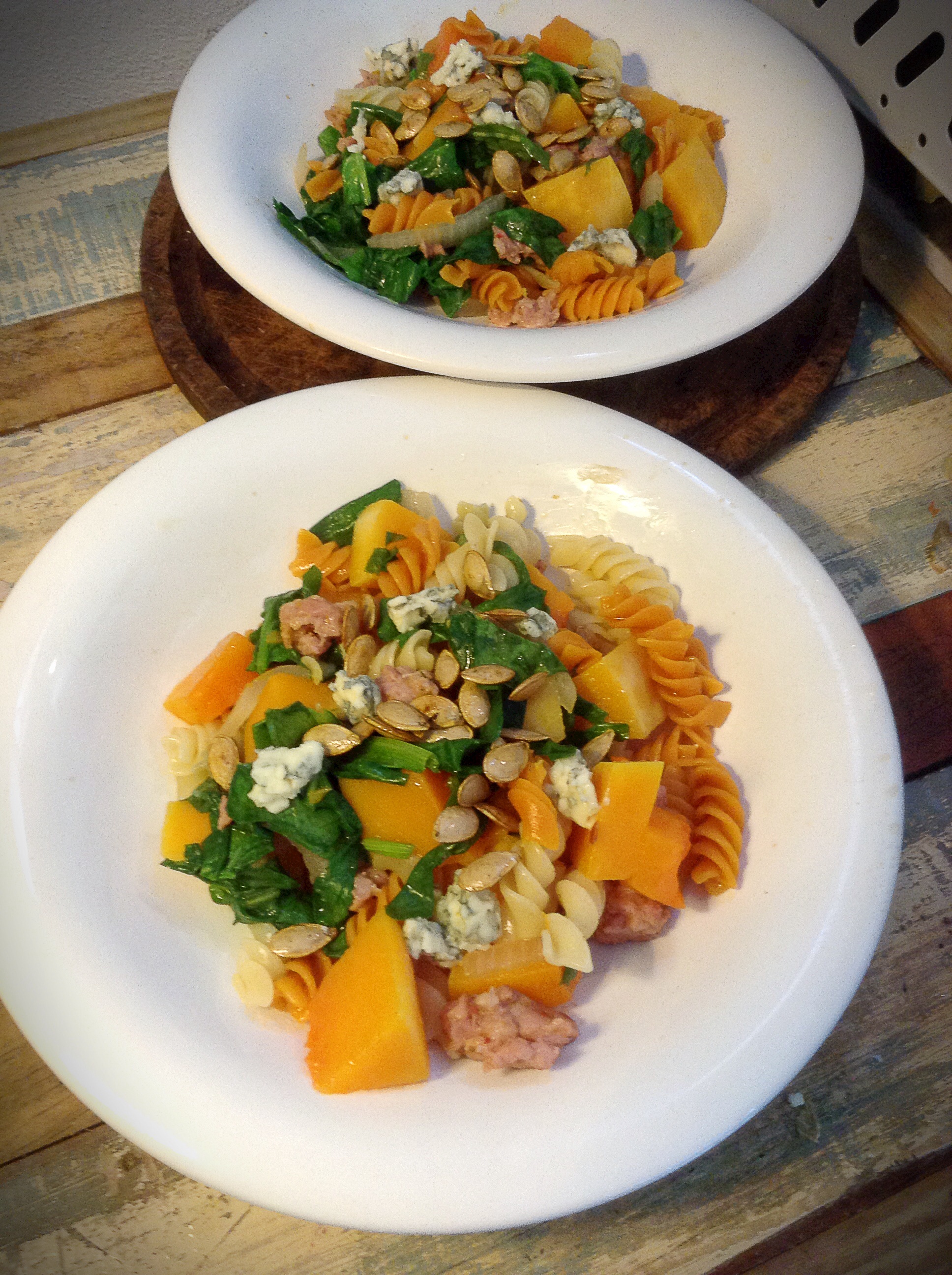 Drain your pasta, reserving 1 cup of the liquid. In the pasta pot, combine pasta, sausage, onions and butternut squash. Stir well to combine, adding the pasta water back in and the remaining olive oil to give it some moisture. Add the chopped spinach and half of the blue cheese. Stir well, the heat from the pasta will wilt the spinach and melt the cheese. Serve, sprinkling with remaining blue cheese and crispy butternut squash seeds.