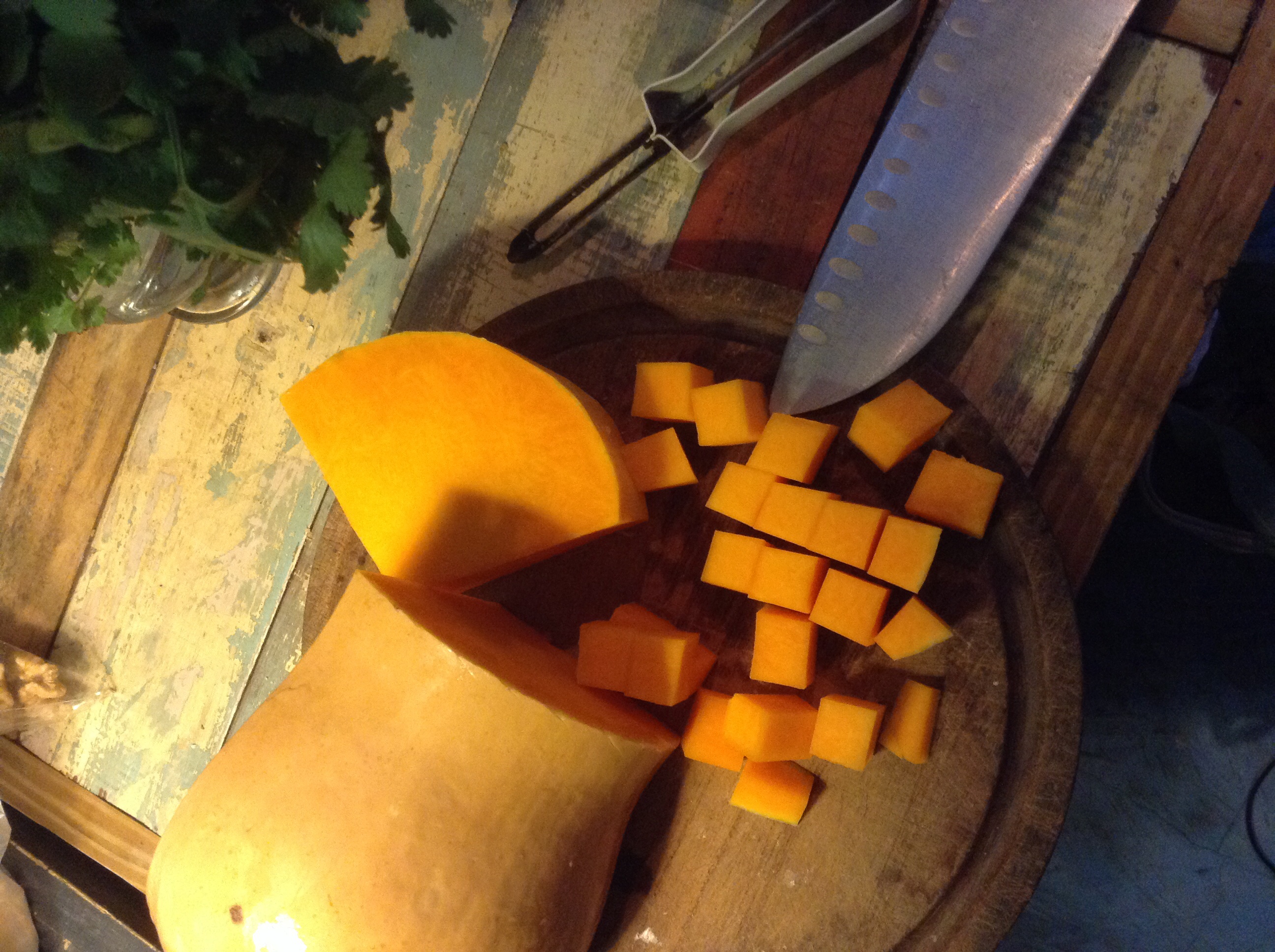 I have this weird obsession with fall foods. I love the abundant summer produce- the easy salads that practically make themselves, and all the grilled vegetables. I love the fresh tender flavors of spring after a cold winter of heavy soups and stews. But more than just about anything I love the flavors of fall. I love the pumpkin and the squash that makes their appearance, apples in all their crisp glory, I love the balance that comes with all the produce of summer winding down- you can still get those juicy peaches that taste like sunshine but you start getting the winter squash, the hearty greens, the persimmons, pears and apples. No matter what the season is, I am always looking forward to fall flavors. I am totally loving Buenos Aires for that- the mild winter means tons of fall produce is readily available. We picked up a butternut squash for AR$5.80/kilo (which was the equivalent of less than a dollar per 2.2lbs) and I have been busily cooking with it since! I would love to have an oven right about now, roasted squash rocks my world and it makes the entire place smell amazing to boot! However, I knew that going on this trip meant some sacrifices, and roasted squash looks like it will have to be one of them.
