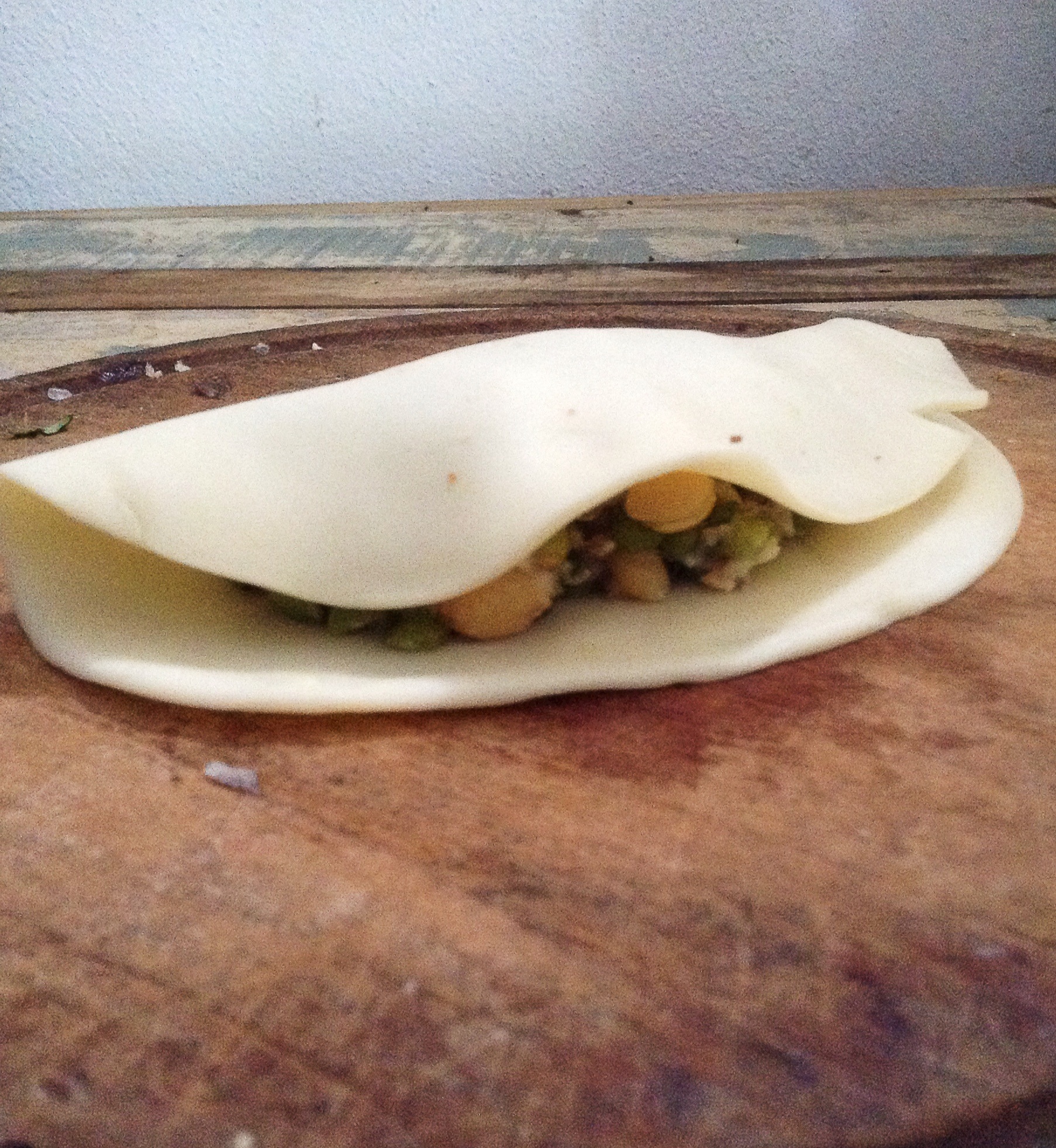 Spoon about 3 Tablespoons of filling onto one half of an empanada wrapper. Fold the wrapper over, on top of itself