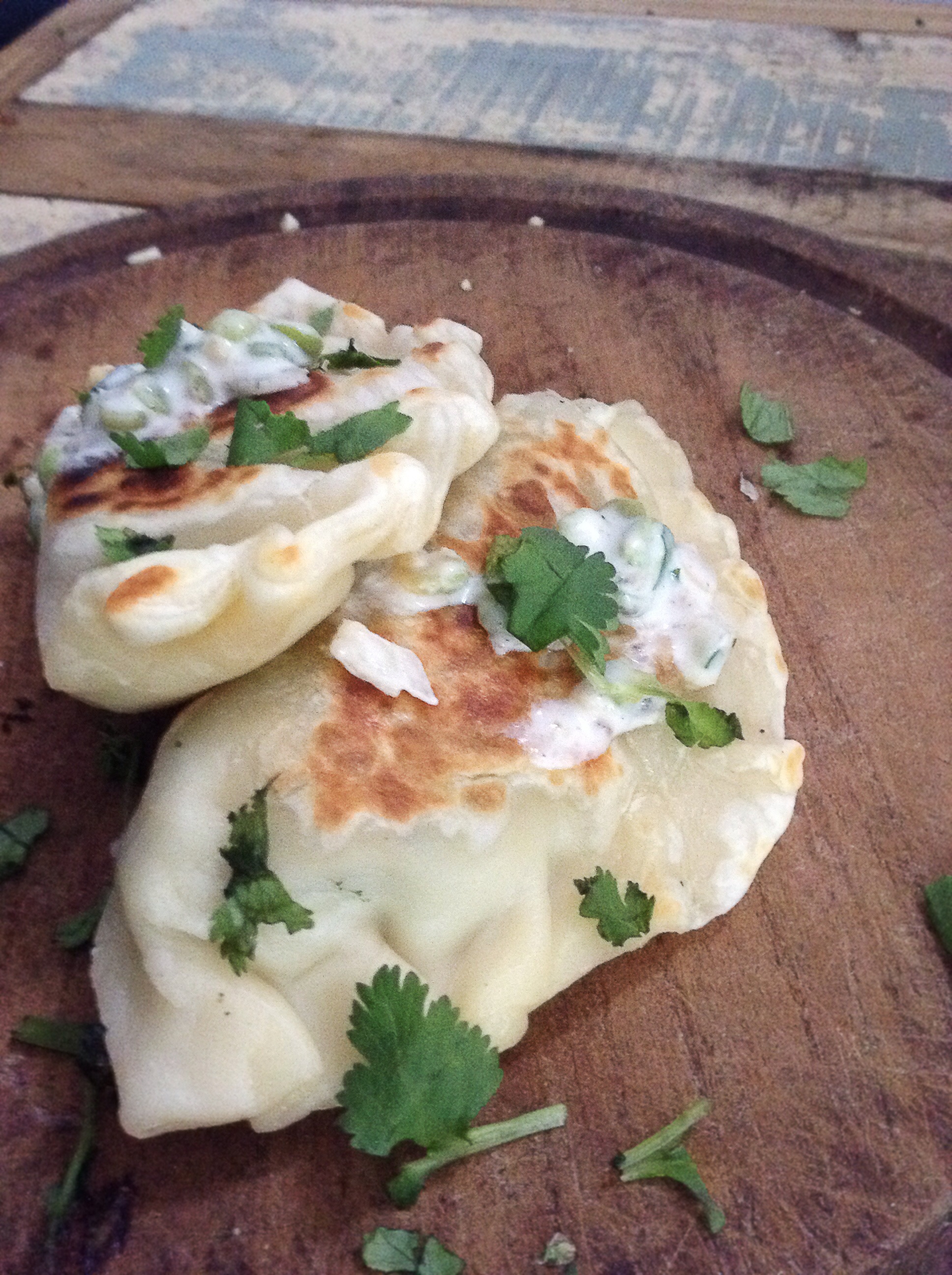 Heat a non-stick pan over low heat, add the empanadas 2-3 at a time. Add 1 Tablespoon of water and cover pan. When water has evaporated, about 1 minute, remove lid and allow empanadas to cook on each side until brown and crispy, about 3-4 minutes per side. When golden brown and delicious looking, remove from pan and serve immediately. I had a little extra filling, so I added a dollop of plain yogurt, mixed it with the remaining filling and called it a sauce!