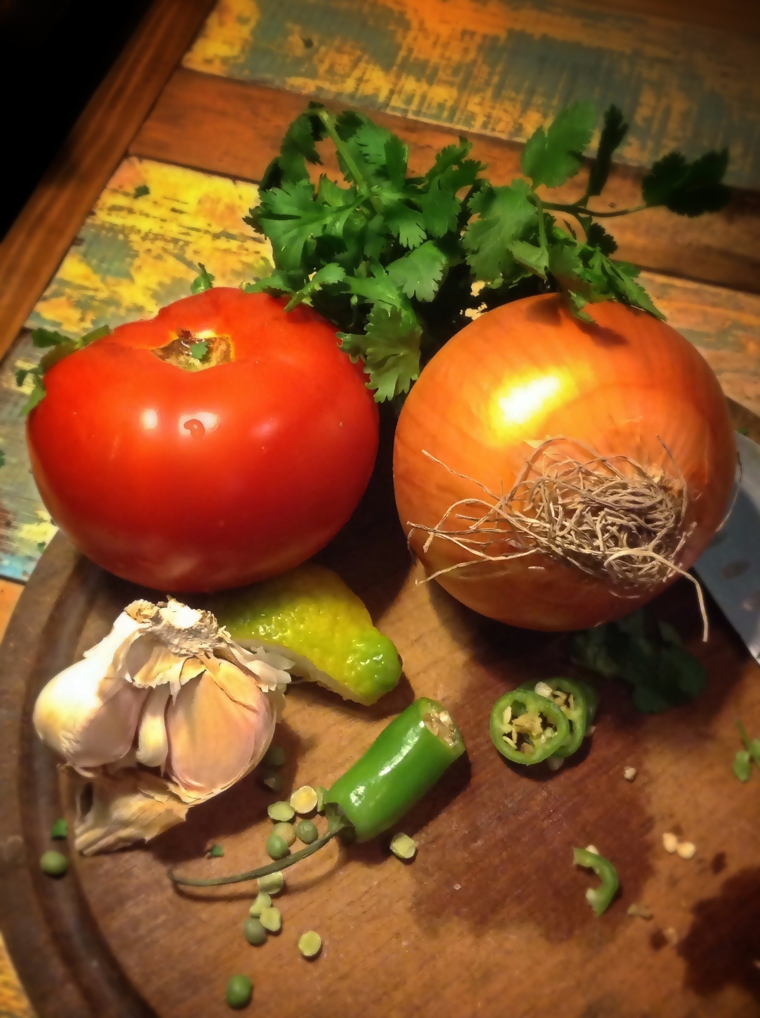 Combine chopped onion, tomato, serrano pepper, garlic, orange juice, cilantro and salt in a medium bowl. Toss well and then add split peas. Allow flavors to blend at least 15 minutes but longer is better. Serve on nachos, tacos, salads… anything!