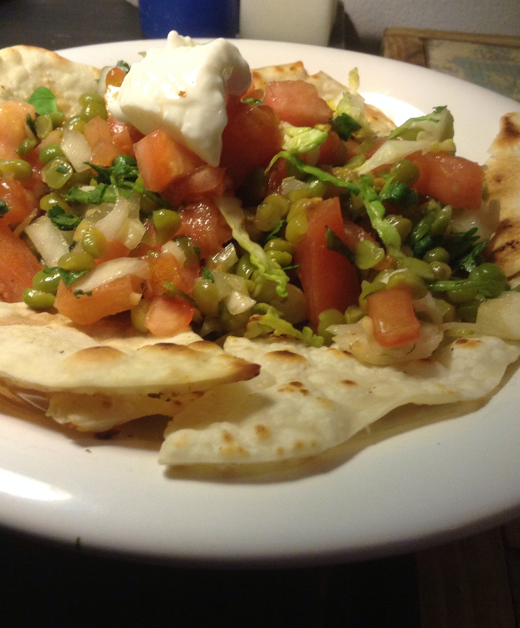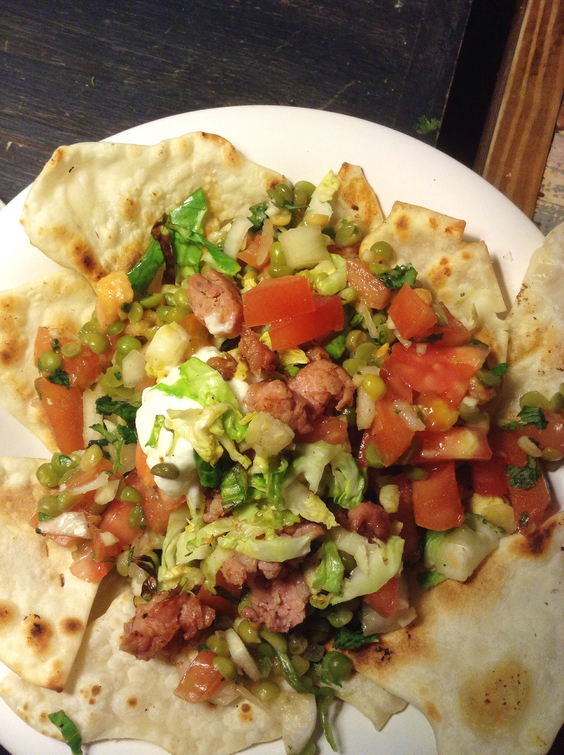 Since I can’t ever leave well enough alone, I tried to make us the healthiest version of nachos possible. We made homemade chips with tortillas (cut into triangles and pan-fried, without oil, until crispy), topped them with a bit of chorizo (yes, chorizo is a high fat meat, but it is so flavorful that a little goes a long way, which is why I used it here, I could get away with less then if I had used hamburger or another bland meat), crispy shaved Brussels Sprouts, spicy Split Pea Salsa and a dollop of plain yogurt.
