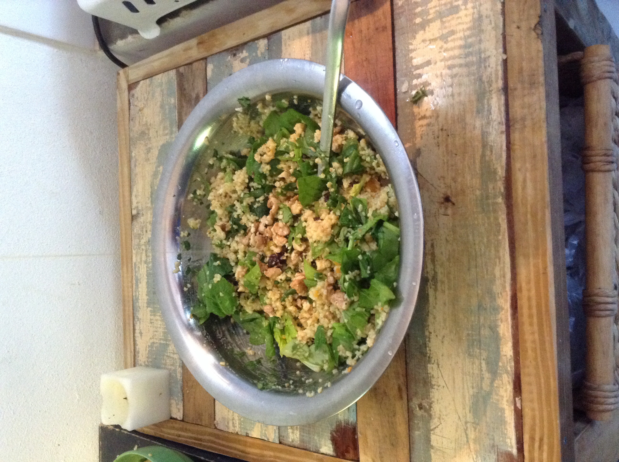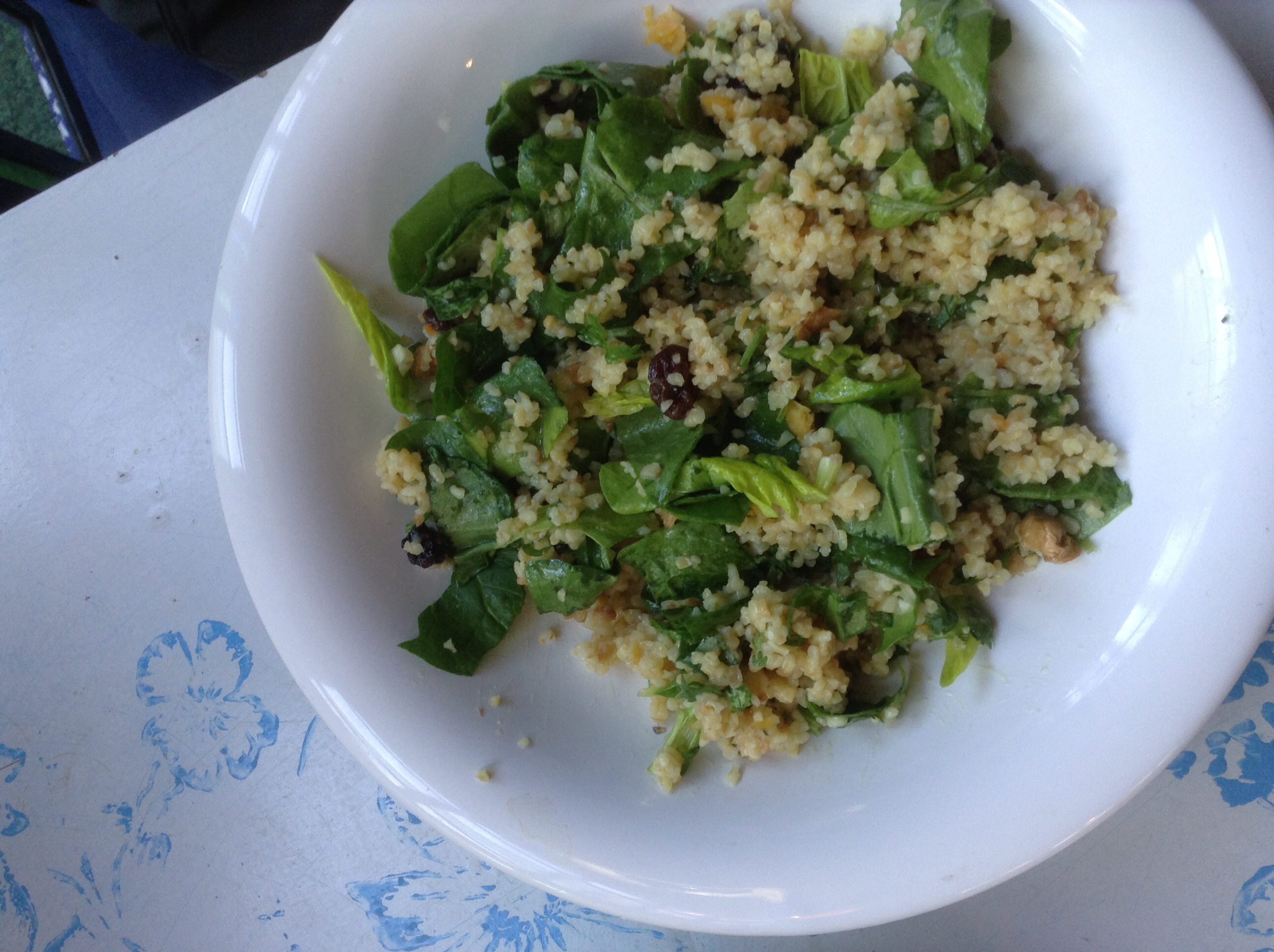 Meanwhile, toss the cilantro and spinach with the bulgur wheat. Add the raisins and dressing and combine well. Sprinkle with walnuts and serve.