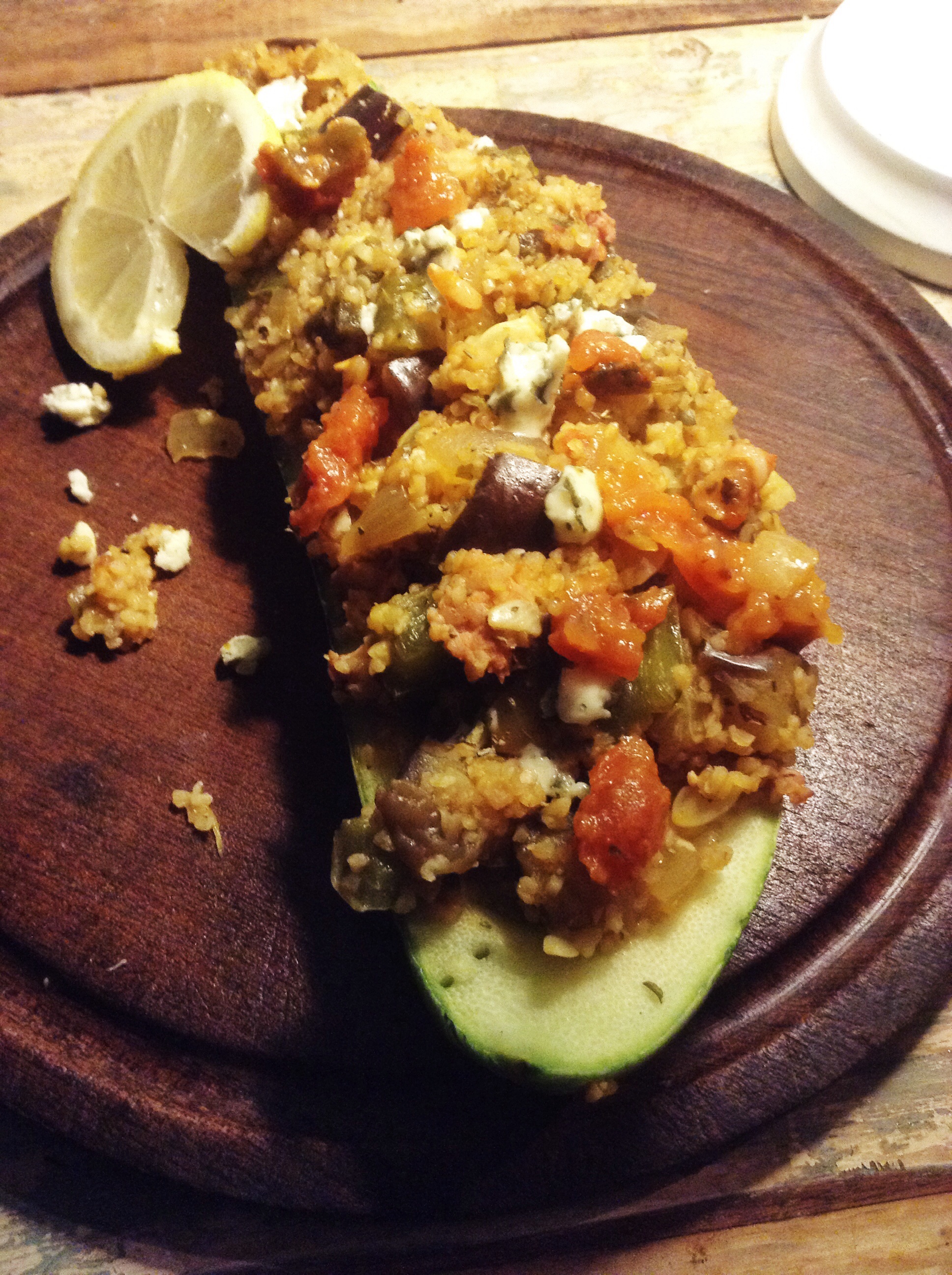 Traditionally, I would bake zucchini boats to get the zucchini soft and crisp up the filling. However, without an oven, that was not an option. Instead, these are steamed on the stove until soft. They take a little initial work, but come together very quickly. After a quick rinse, I used the same pan to steam the zucchini boats as I did to cook my vegetables making this an easy, one pan meal (and one bowl, for the bulgur wheat and to mix the filling together). We happened to have Herbs de Provence here, but a mixture of thyme, basil, oregano, rosemary and marjoram will work in a pinch!